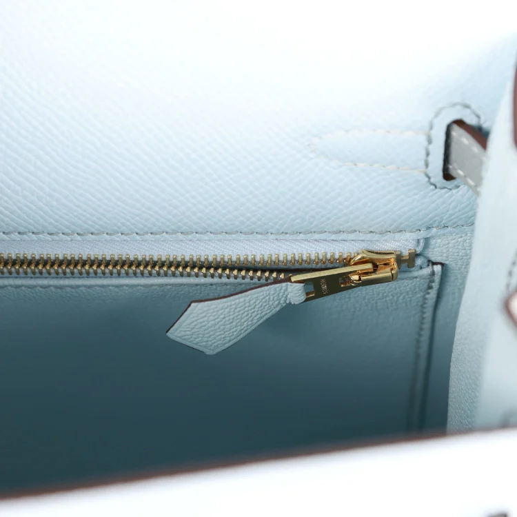 Inside, the bag is lined with Bleu Brume chèvre leather, featuring one zip pocket with an engraved “H” pull and a second open pocket on the opposite side.