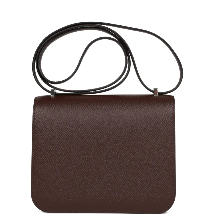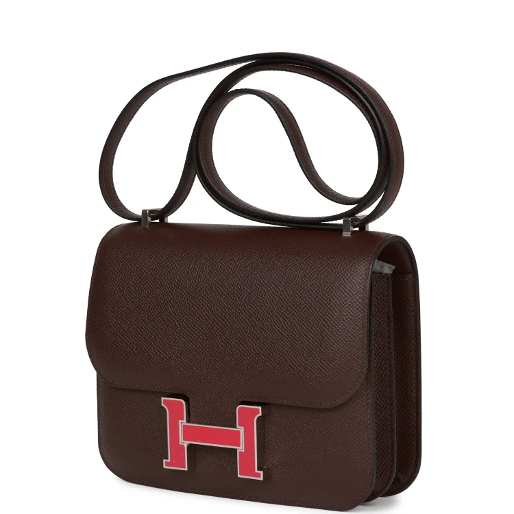 This Hermès Constance bag is crafted from luxurious Rouge Sellier Epsom leather with palladium hardware, showcasing tonal stitching and a striking Framboise enamel and metal ‘H’ clasp. It features an adjustable shoulder strap for versatile styling.