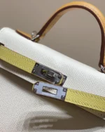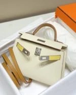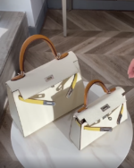 The Hermès Kelly 25 Colormatic is a standout piece that reimagines the classic Kelly silhouette with a vibrant, modern twist. Measuring 25 cm, this compact version is perfect for day-to-evening transitions, offering both elegance and practicality. The Colormatic design features a harmonious blend of contrasting hues, showcasing Hermès’ mastery in color coordination and craftsmanship. Crafted from premium Epsom leather, it boasts a structured form that maintains its shape over time. The bag is adorned with either palladium or gold hardware, adding a touch of sophistication to its playful palette.Hermès Kelly 25 Handbag in Nata Gold Tricolor
