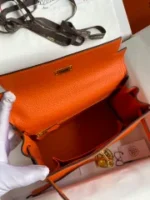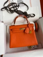 The Hermès Kelly bag in orange is a vibrant expression of confidence and luxury. Known for its elegant structure, top handle, and signature turn-lock closure, the Kelly becomes even more striking in Hermès’ iconic orange hues like Orange H or Feu. Paired with Gold hardware, the look is warm and rich; with Palladium hardware, it feels sleek and contemporary.