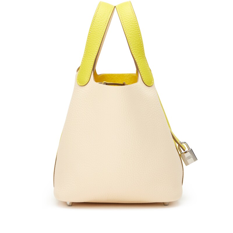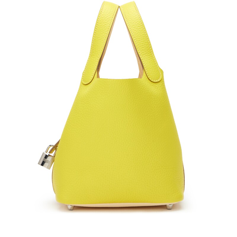 The Hermès Picotin Lock 18 in Lime Clemence Leather with Palladium Hardware is a vibrant twist on a classic silhouette. Crafted from supple Clemence leather, this bucket-style bag features a minimalist design with an open top and secure palladium padlock closure. The bold lime color adds a pop of playful elegance, making it the perfect statement piece for effortless, everyday style.