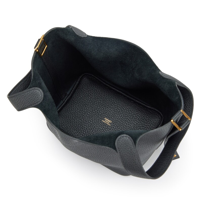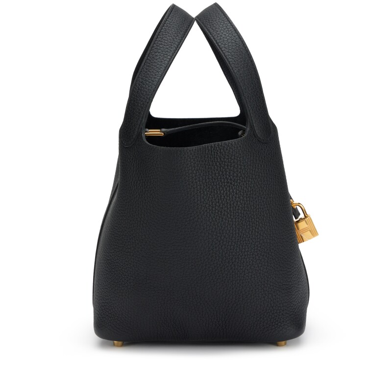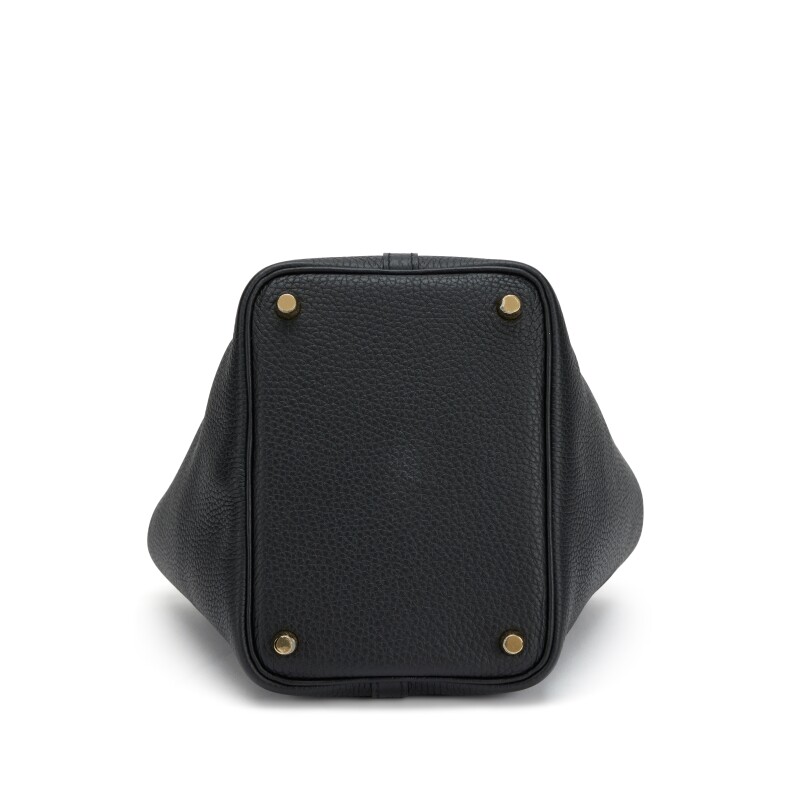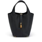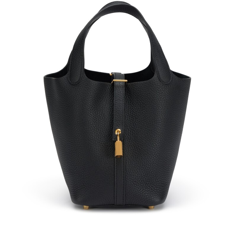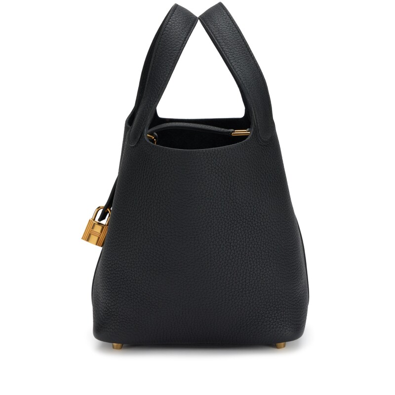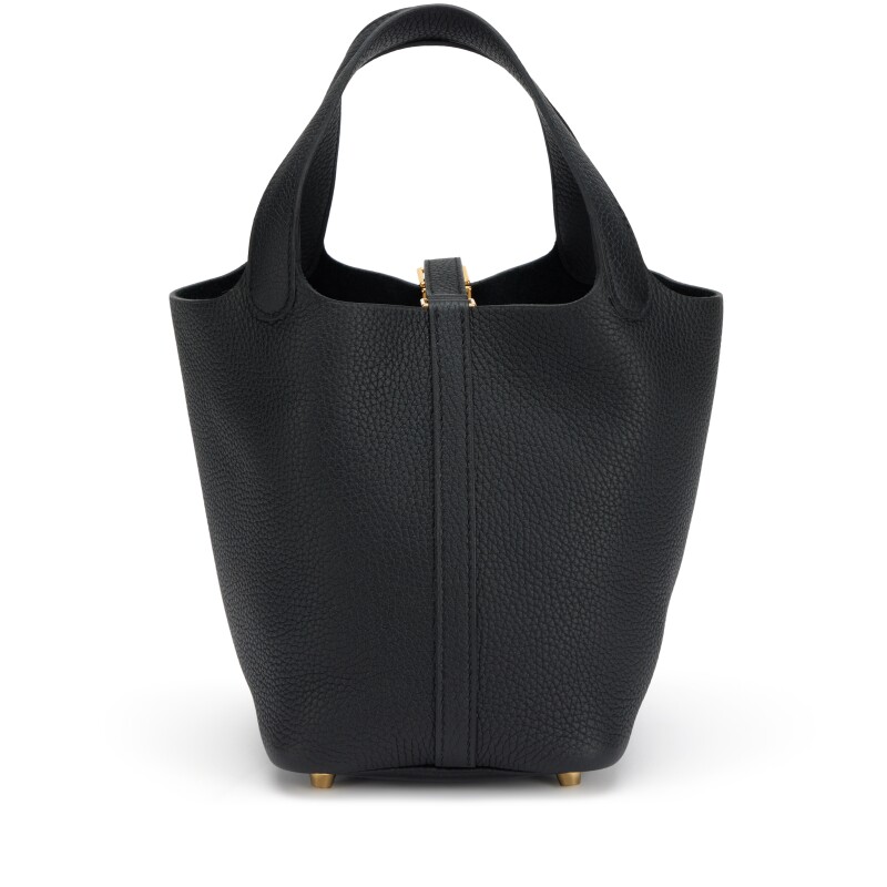 The Hermès Picotin Lock 18 in Black Clemence with Gold Hardware is a timeless classic, combining elegance with everyday functionality. Made from soft, grained Clemence leather, the sleek black hue is effortlessly versatile, while the gold hardware adds a touch of luxury. Its minimalist, bucket-style design and signature padlock closure make it a chic yet practical choice, perfect for refined, understated style.