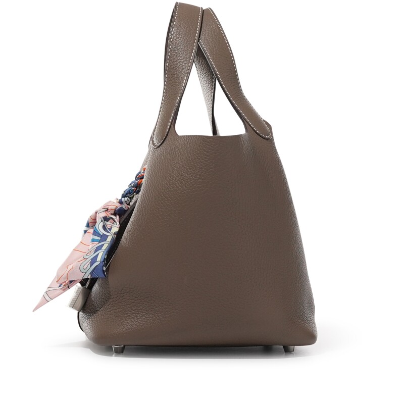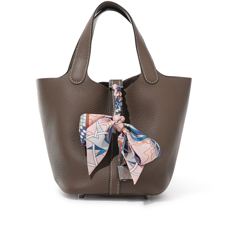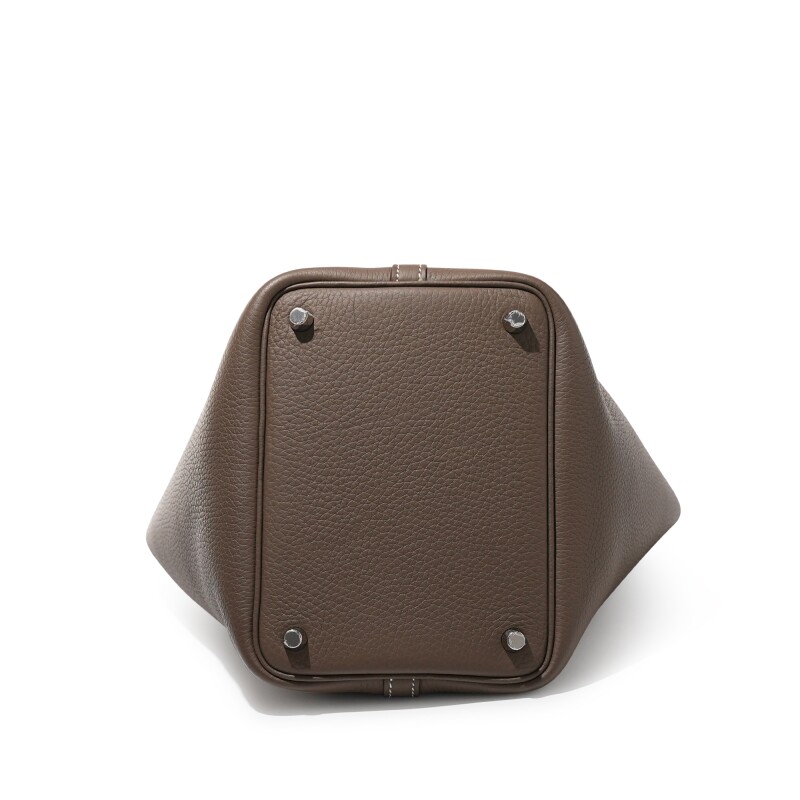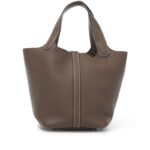 The Hermès Picotin Lock 18 with Palladium Hardware is a refined and minimalist handbag that exudes effortless elegance. Crafted from supple Clemence leather, its bucket-style design offers a relaxed shape with a secure padlock closure. The sleek palladium hardware adds a modern touch, making this compact yet functional piece a perfect everyday luxury essential.