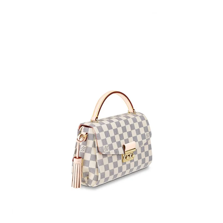 This sleek and compact bag features modern lines and a stylish design. Crafted in summery Damier Azur canvas, the Croisette exudes elegance with its sophisticated details, including the signature S-lock. A playful removable leather tassel adds a fun touch. Perfectly sized to hold your essentials and a long wallet, this versatile bag can be hand-carried, worn on the shoulder, or styled cross-body.