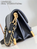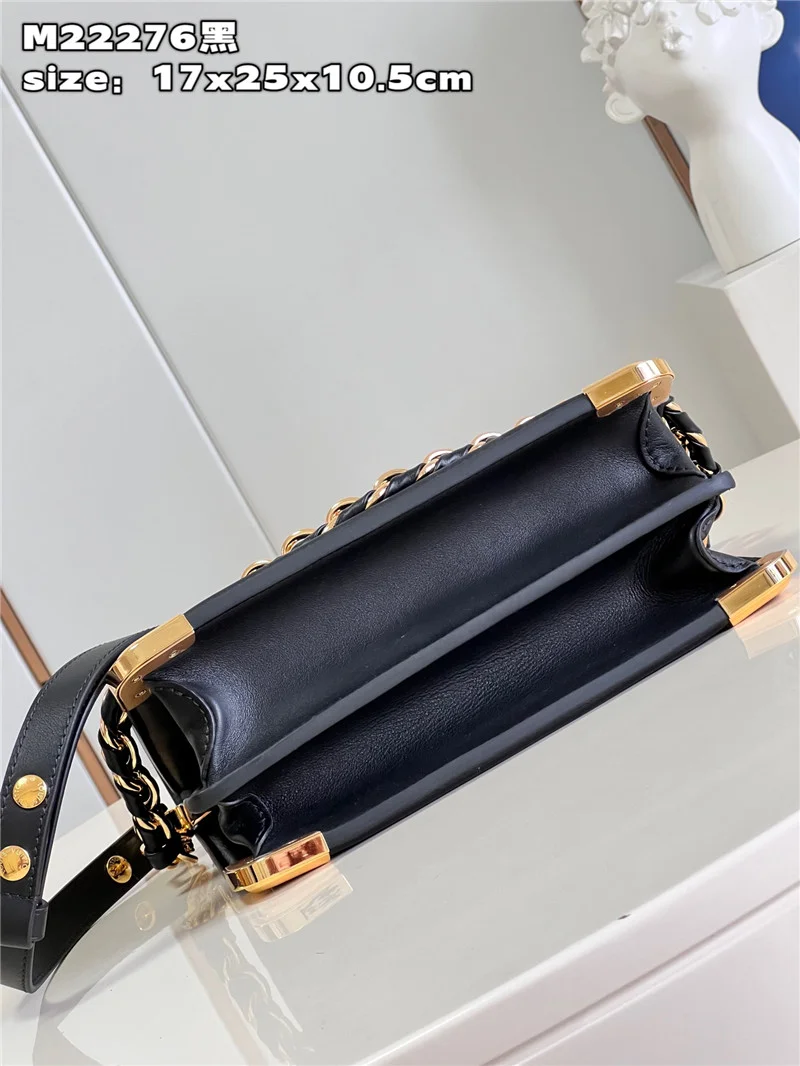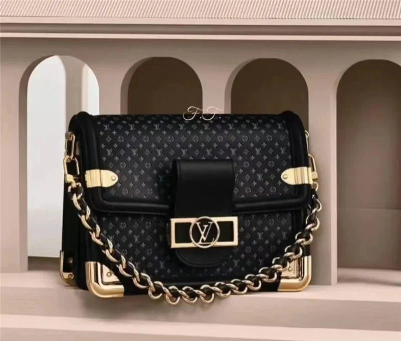 This Dauphine MM handbag is crafted from supple calfskin, featuring the new nano-size Monogram pattern, embossed and printed in a subtly contrasting hue. Designed for everyday elegance, it offers practical elements like two interior compartments and a detachable braided leather-chain strap. Shiny metallic corners and angle brackets pay homage to L’s rich trunk-making heritage.