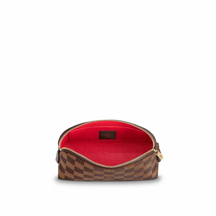 Crafted in iconic Damier Ebene canvas, this elegant cosmetics pouch features a spacious interior and a wide zipper opening, making it easy to store all your beauty essentials. A flat interior pocket is perfect for keeping smaller items, such as a mirror, organized and within reach.Detailed Features: