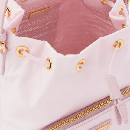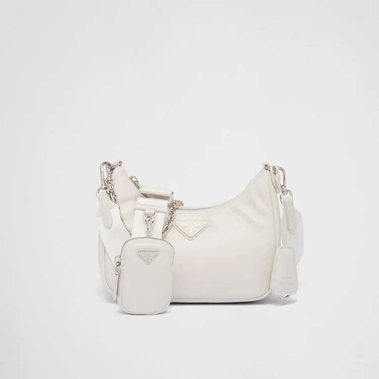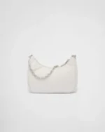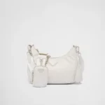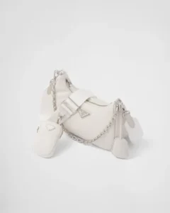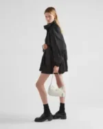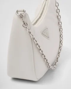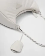 This mini handbag is crafted from padded nappa leather, offering a soft texture and a sleek, minimalist silhouette. The tonal triangle logo on the front frames a contrasting lettering logo, adding a textured, three-dimensional effect that enhances the accessory’s design.