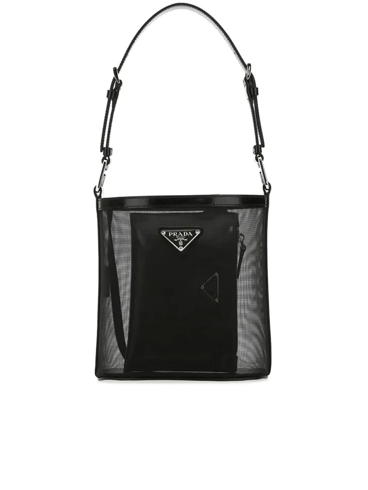 Sporty yet chic, this black mesh bucket bag features the iconic PP logo for a bold statement. Designed with a drawstring closure and adjustable strap, it’s lightweight and versatile—ideal for casual outings or adding an edge to everyday looks.