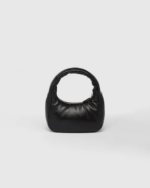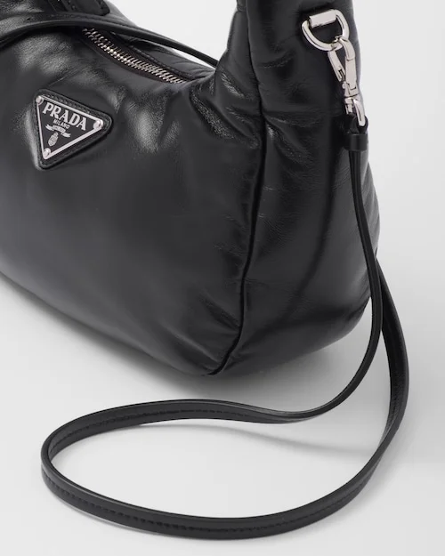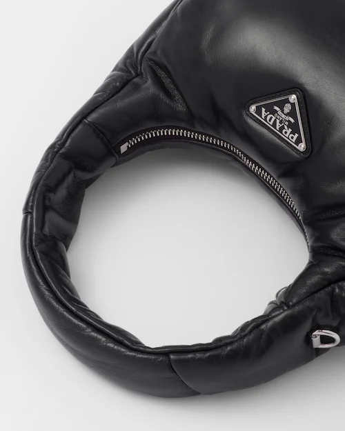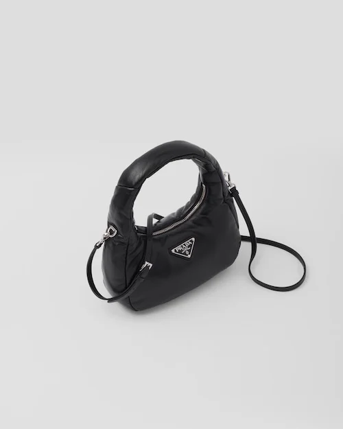Chic and compact, the PP Soft Padded Nappa Leather Mini Bag in Black features a sleek silhouette crafted from luxuriously soft nappa leather. Designed with a padded finish, it includes a top handle, detachable shoulder strap, and signature enameled triangle logo. Perfect for day-to-night styling with effortless elegance.