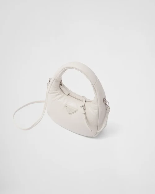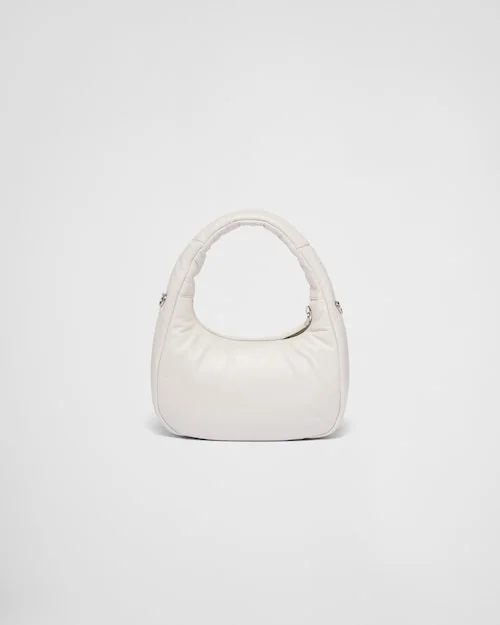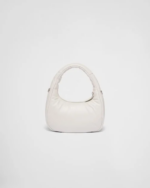 The PP Soft Padded Nappa Leather Mini-Bag in White features a sleek, modern silhouette with a lightly padded finish. Crafted from supple nappa leather, it includes a top handle, detachable and adjustable shoulder strap, and a zip closure. Accented with the iconic enameled metal triangle logo, this mini-bag is the perfect blend of elegance and everyday functionality.