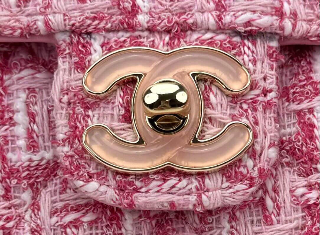 - Luxurious Tweed Fabric: Crafted from high-quality tweed fabric, featuring a delightful mix of pink and white hues, providing a textured and visually appealing look.