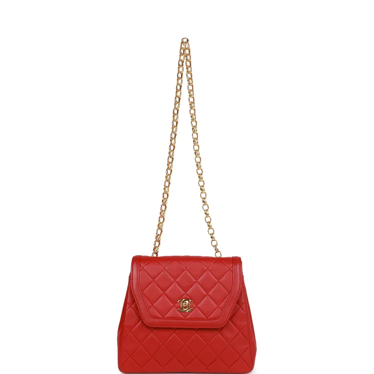 A vintage Chanel CC Trapeze flap bag in red lambskin with gold hardware. It features a front flap with a classic gold-plated CC turn-lock closure and red leather intertwined with a gold chain shoulder strap. The interior is lined in red leather and includes a slip pocket on the back wall.