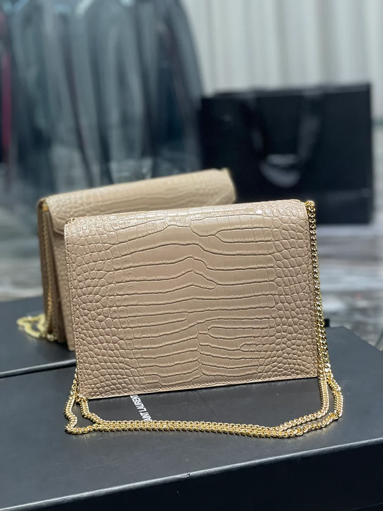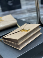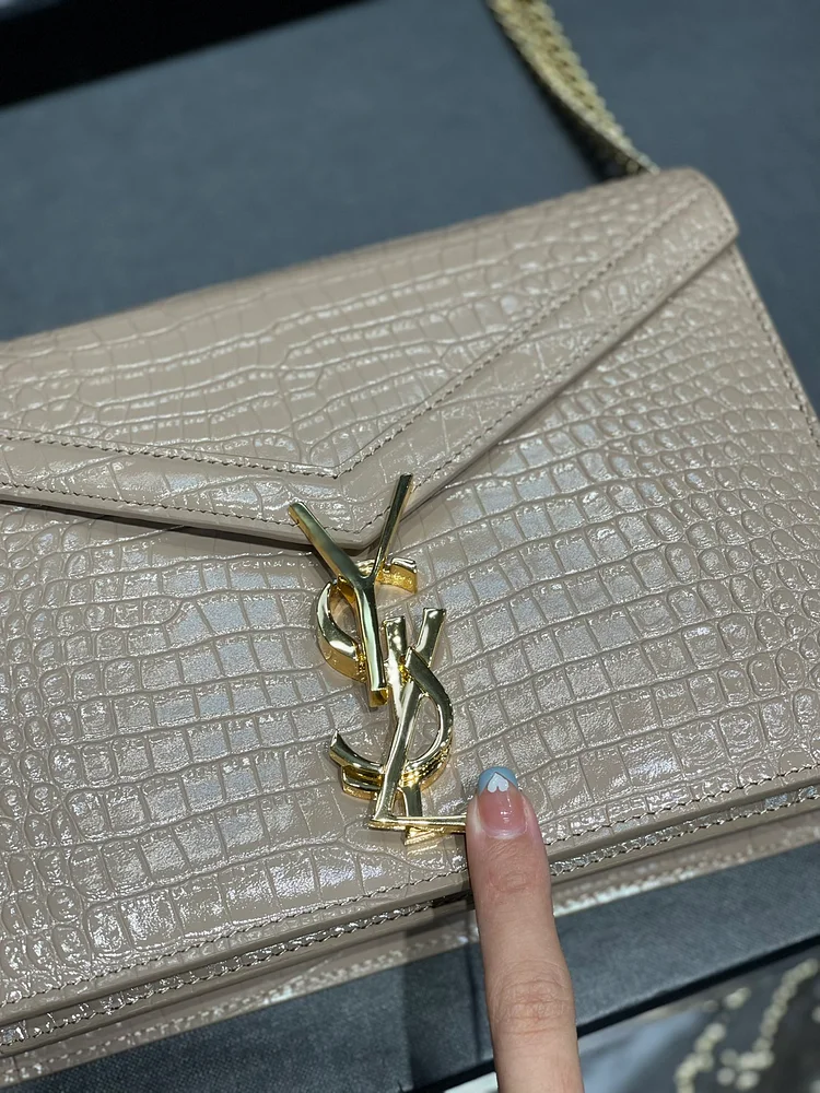 A timeless design in textured grain de Poudre leather, this elegant bag features the iconic YSL Cassandra clasp, refined gold-tone hardware, and a sleek envelope silhouette. Perfect for day-to-evening wear with a detachable chain strap for versatile styling. Made in Italy.