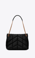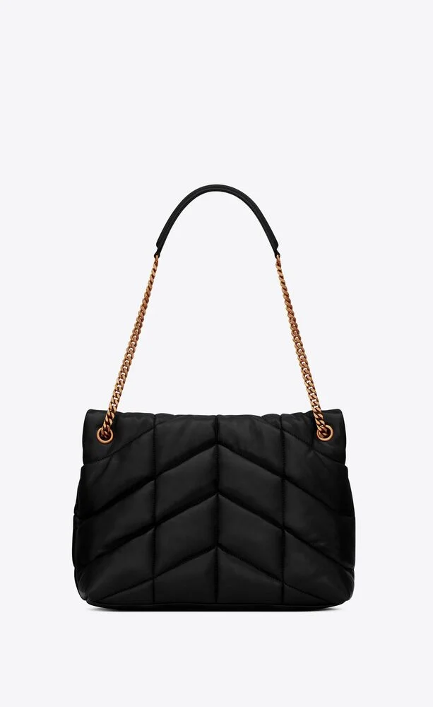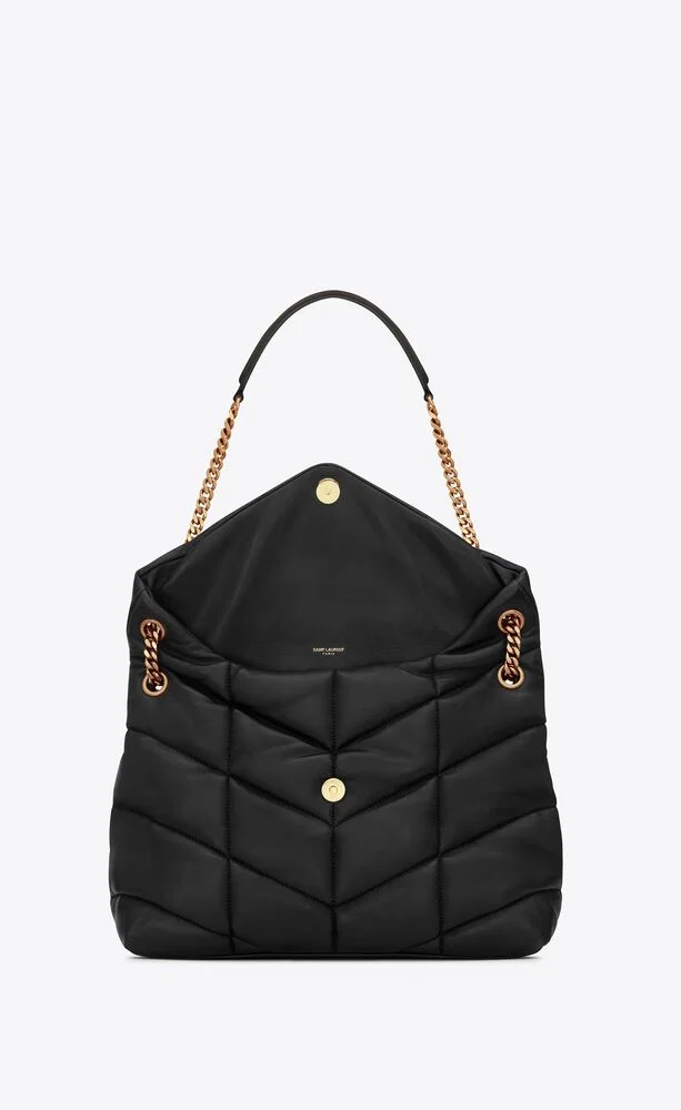 Crafted from soft, quilted 100% lambskin leather, the Puffer Medium Chain Bag blends luxurious texture with bold structure. Featuring a flap design with magnetic snap closure, it’s finished with bronze-toned metal hardware and the signature chain strap that can be worn doubled or long for versatile styling.-
