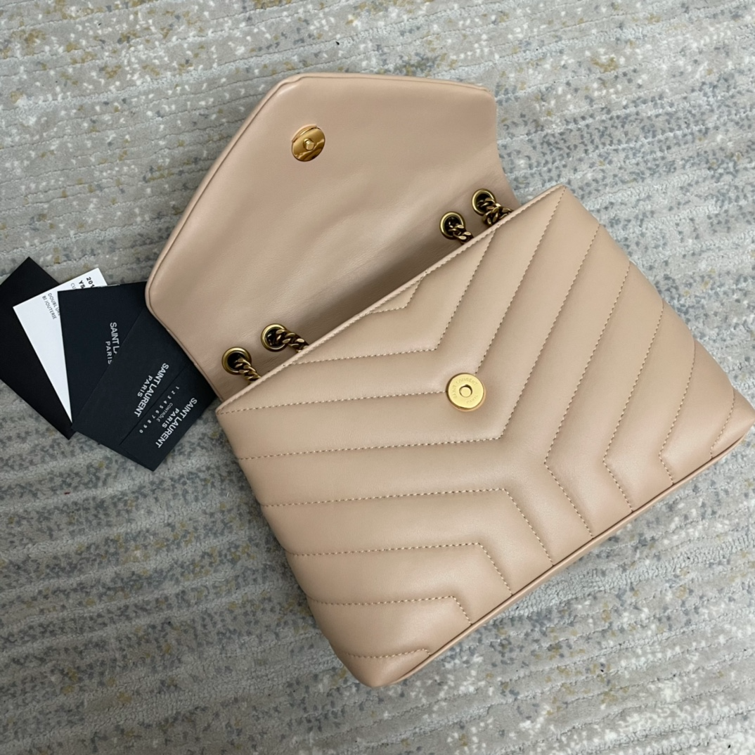 The Saint Laurent Small Loulou Bag is a timeless piece that combines elegance with functionality. Crafted from supple beige calfskin leather, it features the iconic Y-quilted overstitching and is adorned with the signature gold-toned YSL monogram on the front flap. The bag’s structured silhouette is complemented by a sliding chain and leather shoulder strap, allowing for versatile styling options—wear it doubled on the shoulder or extended for crossbody wear.