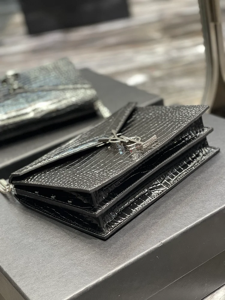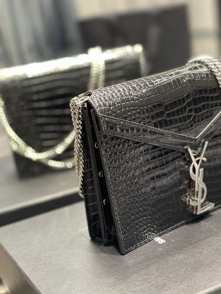 A sophisticated shoulder bag crafted from smooth calfskin leather, featuring the iconic pivoting YSL clasp, gold-tone chain strap, and sleek silhouette. Perfect for elevating any day-to-night look. Made in Italy.