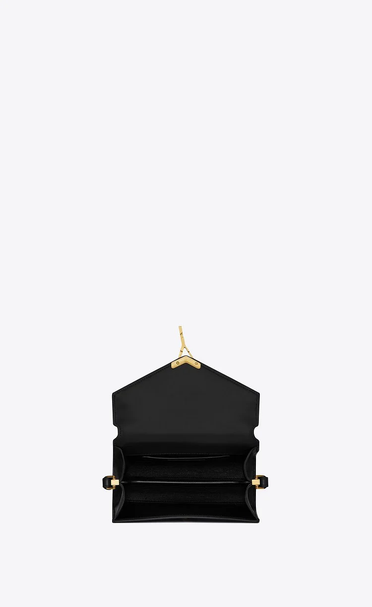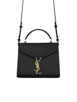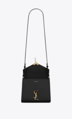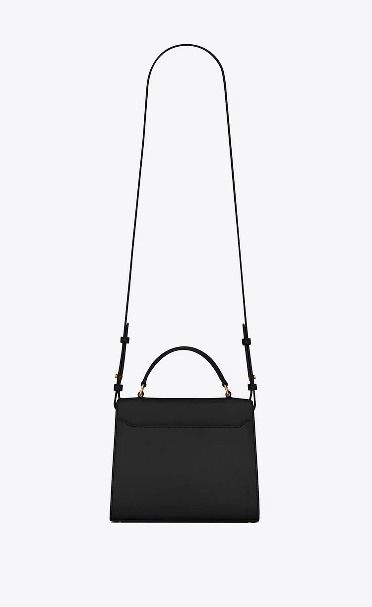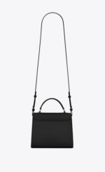 The Cassandra Top Handle Bag in classic black combines elegance with structure. Crafted from 90% calfskin leather and accented with 10% brass, this piece features the signature pivoting YSL logo closure in bronze-toned metal. A padded leather top handle and adjustable, detachable shoulder strap allow for versatile styling.