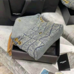 - The Y Puffer Small Bag in quilted vintage denim and suede brings a stylish twist to a classic silhouette. Featuring soft, cushioned texture with a luxurious suede finish, this compact piece is accented with signature Y hardware for a bold statement. Perfect for day-to-night wear, it offers a spacious interior and adjustable strap for versatile carrying. A chic fusion of casual and couture.