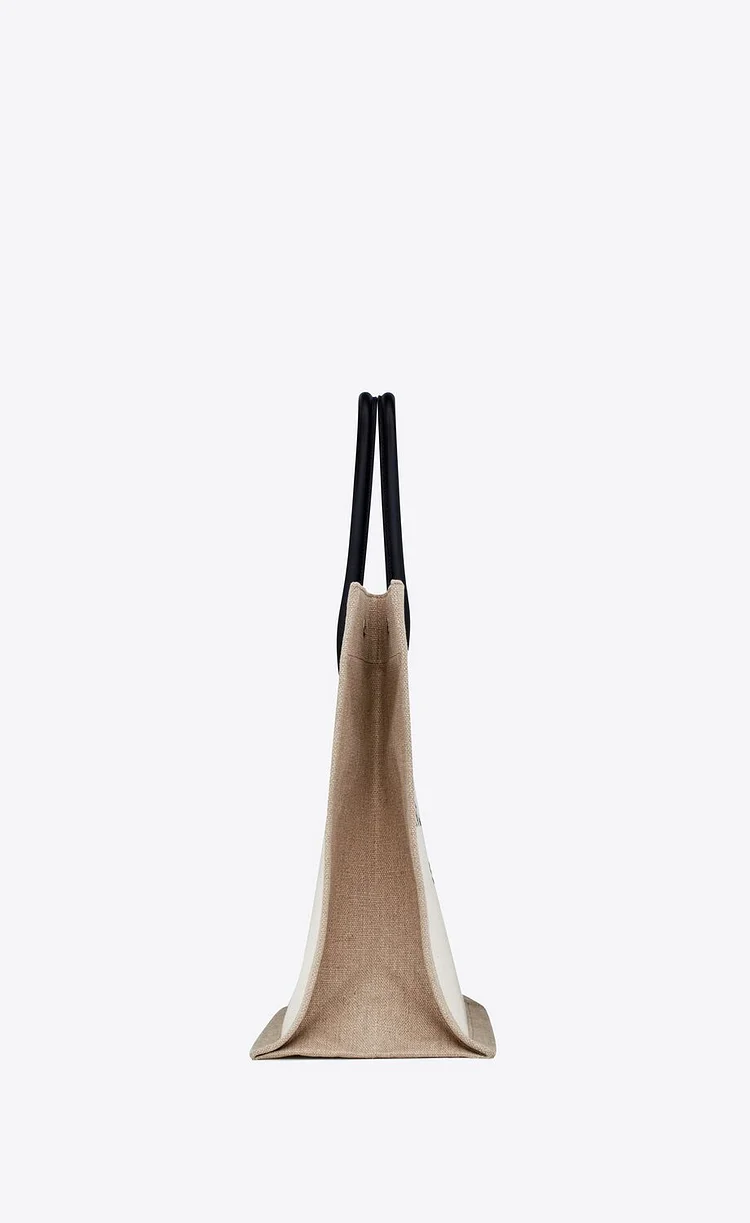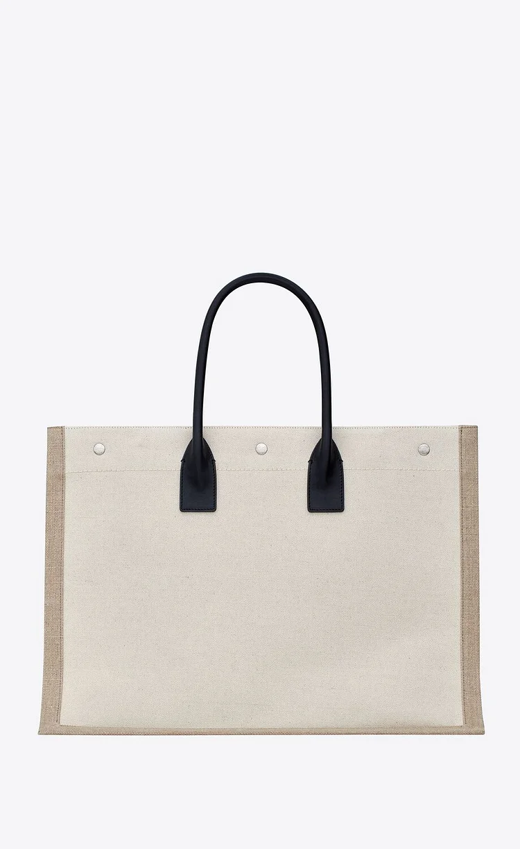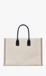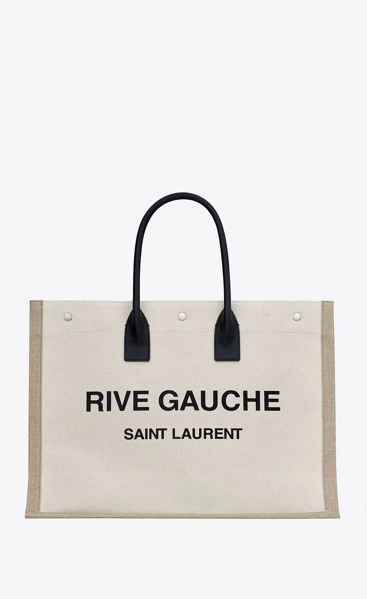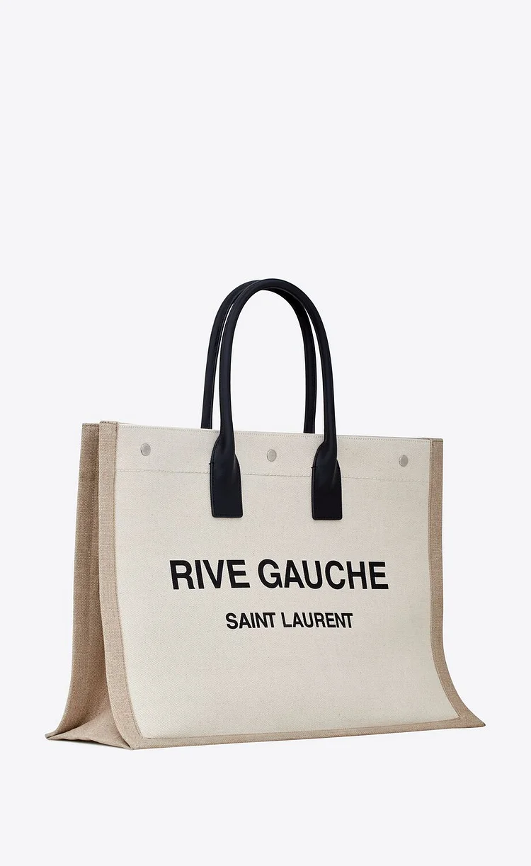 This spacious and stylish tote features a minimalist design with tubular leather handles, an inner zip pocket, and three Saint Laurent–engraved snap buttons for secure closure. Crafted from a durable blend of linen, cotton, and leather, it’s finished with silver-toned hardware and grosgrain lining for a refined touch.-